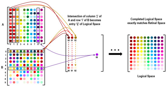 It is hypothesized that at birth, the retinal cells (collectively termed the “retinal space” in the following discussions) do not have established connections with their corresponding neural cells in the visual cortex (the “logical space”) [1]. Among published literature on vision analysis [5,6,7,8], no prior work has addressed the connectivity calculations for the retinal photoreceptors to the brain’s processing unit. To make sense of the photoreceptors’ neural signals and reconstruct an image, the brain must train itself over time by spatially mapping its connections with individual photoreceptors. In attempting to mathematically model and simulate this training, our research considers simpler monovision and does not address the split of right and left vision.