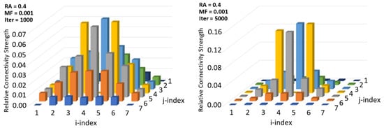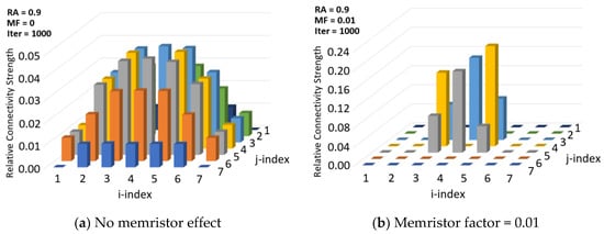 As discussed in Section 3, a memristor factor (MF) was implemented as a dynamic factor for establishing strengths of neural connections. The strength of a connection between two nodes is iteratively updated as New Neural Connection Strength = (1 + MF × Previous Neural Connection Strength). There are no experimental data to validate the exact value of the MF, but as illustrated by the following figures, the numerical simulations indicate that the MF plays an important role in identifying viable connections in synaptic pruning. The MF used here indicates the residual effect of the previous usage added to the current neural connectivity.