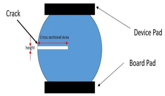 FBGA package solder balls are susceptible to defects, such as void, crack, and fractures. Voids in solder balls occur during the reflow process and they reduce the mechanical reliability of the solder balls []. Cracks in solder balls occur due to thermal coefficient mismatch between the device package and the printed circuit board. The mismatch causes stress on the solder ball and results in cracks in the solder ball [,,,]. These cracks are cumulative in nature and may develop into fractures over the period of time.