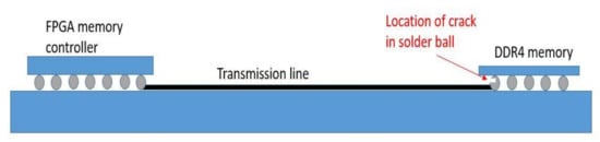 The DDR4 data channel containing the cracked solder ball is shown in Figure 4. FPGA memory controller IBIS model is used for simulation []. Driver impedance is set to 40 Ohms. The package length describes the pin delay due to trace length in the package. R, L, C pin parameters for FPGA are used. Board transmission line is a microstrip line having 40 Ohms characteristic impedance. The electrical model for cracked solder ball is used in the simulation. The self-resistance of the solder ball is 6.9 milliohm. The self-inductance of the solder ball is 69 picohenry. The capacitance due to crack in the solder ball is 325 picorfarads. DDR4 package length describes the pin delay due to trace length in the package. R, L, and C pin parameters for DDR4 memory are used. The on-die termination for DDR4 is 40 Ohms. Micron DDR4 IBIS model is used [].