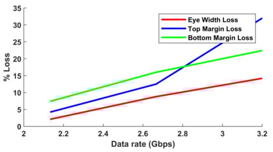 Table 2 shows data eye width, top margin and low margin values calculated for data rates 2.133 Gbps, 2.666 Gbps, and 3.2 Gbps. The percentage loss in data eye width shows the loss due to crack as percentage of the data eye width without crack. Similarly the percentage loss in top margin shows the loss in top margin due to crack as percentage of top margin without crack.
