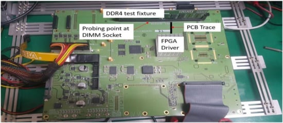 The crack in solder ball can be mimicked by loading the data line with a capacitive element []. The value of capacitive element corresponds to the dimensions of the crack. Figure 10 shows a DDR4 RDIMM module with a 0.2 pF capacitor loaded on the data line. The RDIMM module is used for studying the effects of crack in memory systems in running environment. FPGA based memory controller is used for running PRBS pattern on DDR4 memory channel. FPGA board is standard 16 layer board with 50 Ohm transmission line between the FPGA and DDR4 memory. Figure 11 shows the system board with the FPGA and DDR4 RDIMM module. There are discontinuities in the data channel due to FPGA to board interface, vias, routing of transmission line on the layers of board and DIMM socket. These discontinuities also have an effect on the data eye.