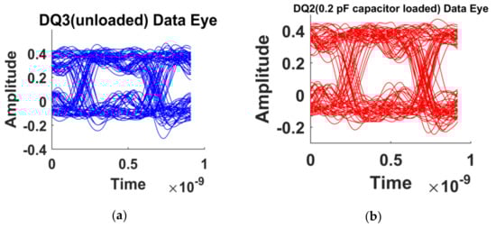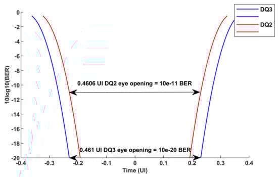 To see the effect of crack in solder ball on the signal integrity of the DDR4 data channel, the data channel is loaded with a capacitive element []. The value of the capacitive element corresponds to the dimensions of the crack. The data eye is measured for the channel with the capacitive loading and is compared with a channel having no defect. The data eye is used to create bathtub plots for the crack defect data channel and the no defect data channel. The comparison of the bathtub plots show the BER degradation due to crack in solder ball [,].