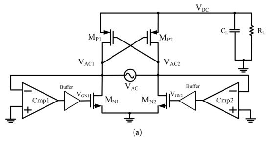As shown in Figure 3, VAC1 and VAC2 are the input of rectifiers from the receiver coupling inductor VAC. Following the change of VAC1 and VAC2, the four power MOS (MN1, MN2, MP1 and MP2) are controlled. When voltage VAC1 is larger than voltage VAC2, the comparator Cmp2 will generate a high signal to turn on MN2, and the current passes through MP1 to charge the output capacitance CL. During another half cycle, voltage VAC2 is larger than VAC1, the MN2 and MP1 will turn off and the MN1 and MP2 will turn on to continue charging the rectifier output. However, as the comparators’ output passes through the buffer to turn on the power NMOS transistors (MN1, MN2), the buffer will generate a delay time to turn on/off MN1 and MN2. The turn-on delay time to the charge output is less than is required. The turn-off delay time leads to a reverse current problem. These delay problems may waste the power of the rectifier.