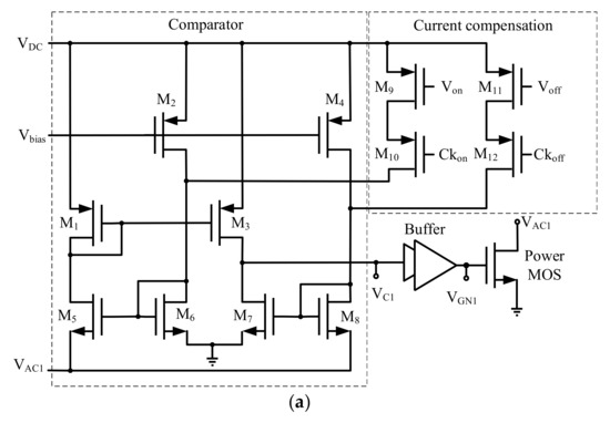 Until now, many kinds of techniques for delay compensation have been proposed [6,7,8,9,10,11,12,13,14,15,16,17,18]. In this work [9], both input signal VAC and ground voltage (VSS) are fed to the error amplifier (EA) for comparison. The error voltage controls the injected current to the push–pull comparator use to compensate the delay. As the feedback loop is stable, it can generate a stable voltage to set the offset current. In Reference [9], the VAC is larger/smaller than VSS, which indicates the NMOS turn off to late/early, and Voffset-off is decreased/increased to allow offset current to turn off NMOS earlier/later. In Reference [10], the feedback-type operational transconductance amplifier (OTA) is replaced with the error amplifier. In this work, it is implemented with a control logic circuit to control the timing of the comparison. The value of VAC is a sample and is passed to the OTA and compared with VSS. The output voltage (Vea_off) of OTA adjusts the offset current of the comparator. After several cycles, Vea_off is adjusted to the steady-state value. For both EA and OTA, it is very slow, and it costs many input cycles to calibrate the correct voltage. In Reference [11], the power stage contains two cross-coupled PMOSs and two power NMOSs (MNA and MNB) controlled by adaptive-delay time control (ADTC) by sensing the input AC signal. The ADTC generates the delayed pulses for power NMOS by tracking the optimal on/off time. The optimal on/off time of the power switches is generated by two current-controlled delay lines (CCDLs) in the ADTC. Therefore, the rising edge and falling control signal of the power NMOS are generated by the delay-line method rather than using the continuous-time comparator. In Reference [13], the control pulse of the power transistor is generated from the digital circuit. The digital circuit is able to control the on/off delay compensated in the active rectifier. The compensation current’s on-current and off-current are injected into the comparators, when they are needed, to reduce the buffer’s delays. A single-comparator architecture and auto-calibration mechanism are implemented in Reference [14]. The falling edge of the gate driving signal should be located at the zero-crossing point of the comparator’s input to prevent reverse current. The auto-calibration mechanism circuit senses the time error in which the output of the comparator is away from the zero-crossing point. In Reference [15], a two-step coarse- and fine-tuning circuit is implemented for shifting the voltage level of the comparator’s input signal. The coarse/fine-tuning block generates digital control signals to adjust the current mirror arrays according to the detection signals. The offset current of the current mirror array could be tuned up or tuned down for a wide delay compensation range. The propagation delay of comparators and buffers is relative to the rail-to-rail supply voltage. In Reference [16], the lower supply rail is provided by the double-pass regulator that shifts the lower supply level from zero voltage to 1.4 V. With this technique, lowering the rail-to-rail supply voltage can improve the delay time of the comparator and buffers. The 3.3 V transistor devices in the comparators and buffers are replaced with 1.8 V devices that can reduce gate capacitance and ON resistance of the transistor. In Reference [17], the dual-loop adaptive delay compensation circuitry for fine control and coarse control isused to adjust the offset of comparator. The initial is set with fine control to provide a smaller level offset current. For fine control, the inputs of the rectifier are sampled and fed to the error amplifier, which generates a DC offset voltage. The offset voltage is proportional to the delay time of the buffer and comparator. The coarse control compares the error voltage with high and low threshold levels for small and large compensation scenarios, respectively.