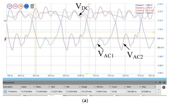 The proposed rectifier is fabricated in 0.18 μm CMOS process with standard I/O devices. The microphotograph with its floorplan is shown in Figure 11. The core area of the chip is 0.24 mm2. The outputs of the active rectifier included in the external resister and capacitor are 300 Ω and 2 nF, respectively. The measurement setup is shown in Figure 12. The experimental setup includes a current waveform analyzer Keysight CX3324A, CX1101A current probe and N2862B passive probe (Keysight Technologies, Santa Rosa, CA, USA). In this measurement, the distance between primary coil L1 and secondary coil L2 would influence the magnetic resonant amplitude. Therefore, we put it as close as possible for maximum amplitude to be received by the inductor L2. The proposed IC die is attached directly to PCB and bonded out with 5–6 mm aluminum wire. The ringing of the measured signal is due to the bond wire and the onboard capacitance in the PCB. The AC input voltage amplitude ranges from 2 V to 3.8 V, and the resonant frequency is fixed at 13.56 MHz. Figure 13a shows the measured waveform of the active rectifier without a phase error detector. Figure 13a shows very serious ringing for the AC input waveforms, and the ringing inside the chip is expected to be even more serious. Figure 13b shows the measured waveform of the active rectifier without the phase error detector. Figure 13b shows less ringing for the AC input waveform and demonstrates the effectiveness and accuracy of the proposed technique. Figure 14 shows the measured PCEs with load resistor that range from 100 Ω to 1300 Ω when the input voltage is 3.3 V. As shown in Figure 14, the minimum load resistance is 50 Ω with 2 nF of the external capacitor. The optimized PCE is allocated at 300 Ω load, and its output power is 109 mW. Figure 15 shows the performance of the rectifier in various input voltages. The measured VCR with the output voltage ranging from 2 V to 3.8 V are higher than 90.3% when RLoad = 300 Ω and 90% when RLoad = 600 Ω, respectively. The measured result of the output current with output load resistance ranging from 100 Ω to 1300 Ω is shown in Figure 16. The proposed rectifier generates current from 2.6 mA up to 55.4 mA with 3.3 V input voltage. Table 2 compares the performance of the proposed work with state-of-the-art active rectifiers. The proposed rectifier achieves high PCE and VCE over a wide loading range from 100 Ω to 1.3 kΩ. A peak PCE of 90.3% and maximum output power of 109 mW are achieved at 3.3V input voltage. The proposed circuit is well-suited for a wide range of input voltage and loading resistors. The phase error detector works well to remove the phase difference due to the buffer itself.