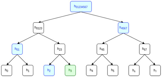 Figure 1 contains an example of a MHT with 8 leaves. To show that a certain value is stored in a leaf of the MHT, one can create a Merkle proof (MP), which consists of a list of the additional nodes required to compute the root of the tree. For instance, a MP showing that is stored in the MHT from Figure 2 would consist of the nodes