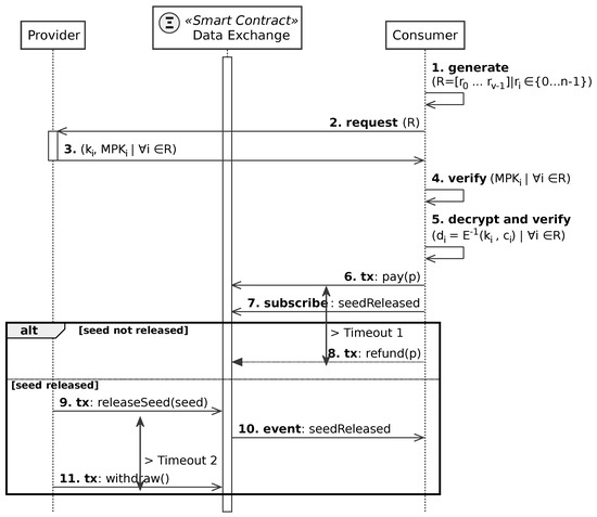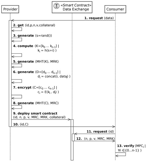 - Provider→Consumer: Send and the complete set of cryptograms (C).Finally, the provider delivers the smart contract address, the data-exchange identifier , and the complete set of cryptograms C to the consumer. Obviously, it would be totally impractical to exchange that amount of data using the ledger as storage. Instead, the exchange of cryptograms between the provider and consumer is done off-blockchain. Notice also that since the seed will be public at the end of the process, all the off-blockchain traffic must have been exchanged using a secure channel.