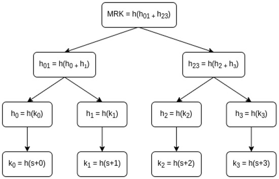 Figure 4. Tree of keys . In this example, MRK = . - Provider: Generate ] | ∀i .Now, using the pre-existing data to be exchanged, the provider has to build an array () with the portions where each has the corresponding data and the index as a header ). This format is going to allow the smart contract to determine if the cryptograms have been properly generated. It is also important to note that each data portion contains a group of random registries, not consecutive ones. To do that, registries are sorted using an external random generator tool provided by the marketplace, which should be open source and auditable to avoid duplicated entries in the same portion. This will avoid a potential attack where the consumer replicates several data requests to obtain free samples without committing any payment. More details about potential attacks can be found in Section 5.3.