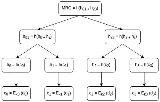 Figure 5. Tree of cryptograms . In this example, MRC = . - Provider→SC: Deploy smart contract with parameters (, n, p, v, , , ).Next, the provider deploys a smart contract in a ledger that stores the data-exchange identifier (), the total number of portions (n), the number of sample portions to be revealed before the payment, the price (p) of the dataset, and the amount of cryptocurrency to assure the fairness from the provider on the conflict resolution process (), and the root of both Merkle hash trees (,). These roots will allow proving whether an element is or is not a cryptogram or a key and its position in the MHT. Using this, the system is able to efficiently assure the consumer that the provider cannot alter the committed dataset.