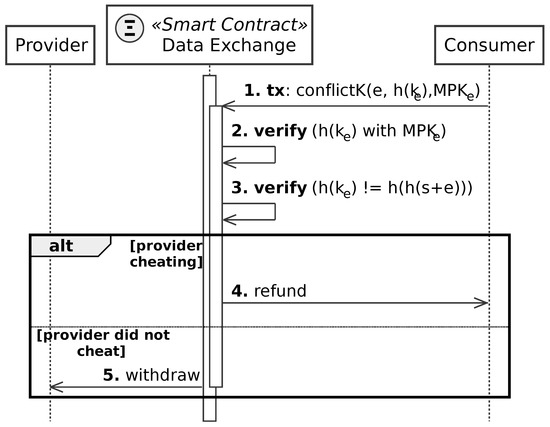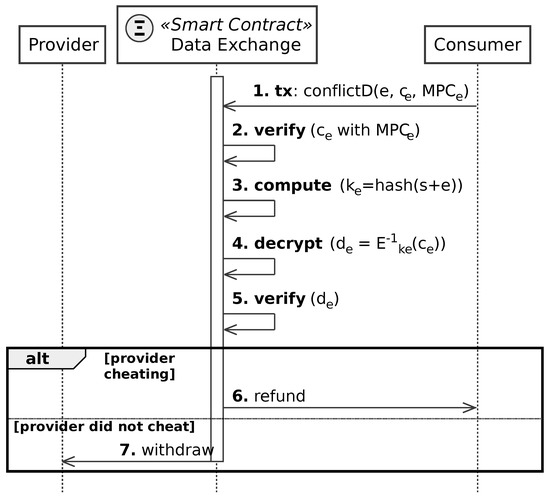 Figure 6 details the interactions between provider, consumer, and smart contract during the execution phase of the DEFS protocol. The steps of this phase are enumerated as: