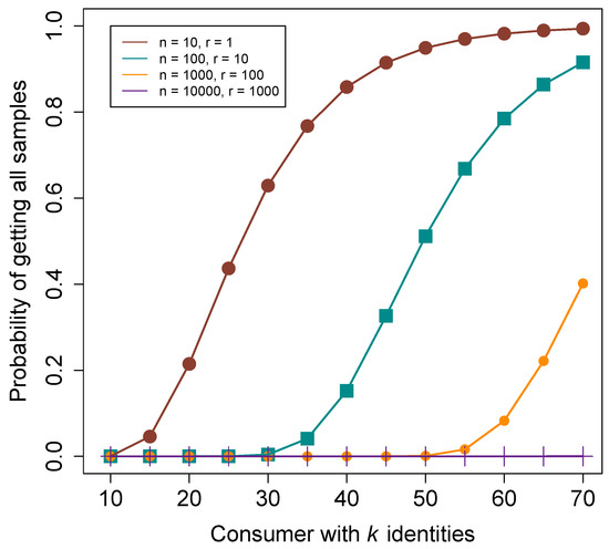 In Figure 10, we illustrate the probability that a consumer with k identities that gets 10% of free samples with each identity, obtains the whole dataset of n registries.