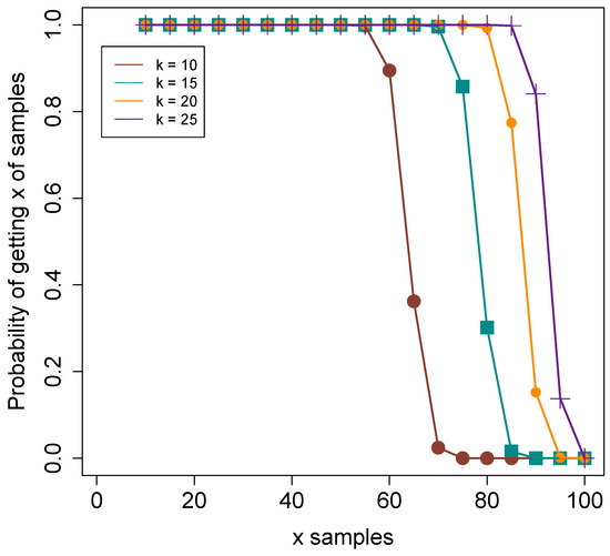 As we can see, there is a significant drop in the probability of obtaining at least a 65% of samples with 10 identities, but with more identities, this inflection point moves up to 80% (with ), 90% (with ), and 95% (with ). Therefore, even though the probability of obtaining the whole 100% of the dataset is very close to 0, with 25 identities, it is possible to obtain at least the 90% of it with probability 0.84.