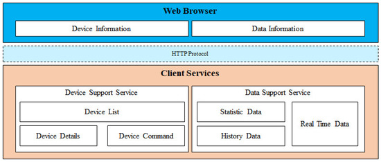 Figure 3 illustrates the development model of client services. To improve user convenience, we designed the client services with device support service and data support service. With the device support service, users can gain information about the device list managed by the intelligent edge computing platform, device details provide a detailed profile of the device, and device command that is served by this device. The data support service provides statistic data, history data, and real-time data which are generated by the devices.