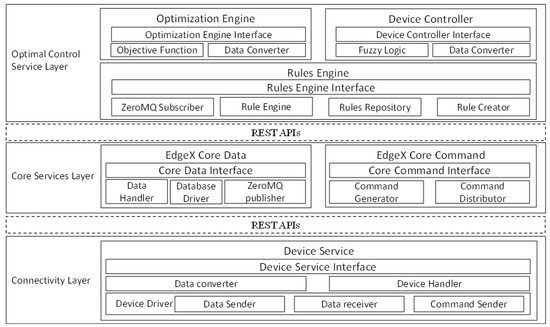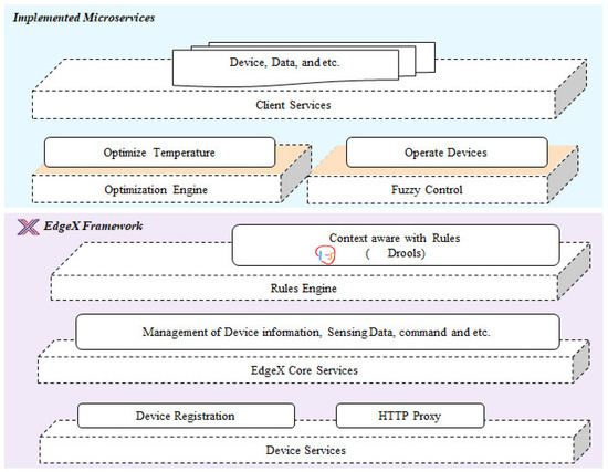 Figure 9 illustrates the developed functionalities of intelligent edge computing platforms using EdgeX. The intelligent edge computing platform contains several microservices. The device microservice for communicating with IoT devices is located between the intelligent edge computing platform and the IoT device for transmitting data or commands in both directions. EdgeX core services provide basic services required for an intelligent edge computing platform. The core data manage and stores data, core metadata manage information of IoT devices, and all services related to the intelligent edge computing platform while the core metadata manage and deliver commands through REST APIs to the services provided by IoT devices. The rule engine, which provides basic intelligence in the intelligent edge computing platform, provides basic judgment to the intelligent edge computing platform based on pre-registered rules. In controlling the environment of a smart house, we propose an optimization engine and a fuzzy controller that supports the rule engine to minimize energy consumption while maintaining user preferences. Based on the currently collected temperature information, the optimization engine provides an optimized temperature that can satisfy user requirements while minimizing energy consumption, and the fuzzy-based controller properly controls the temperature environment of the smart house based on data of both the optimization, desired temperature and the current temperature.