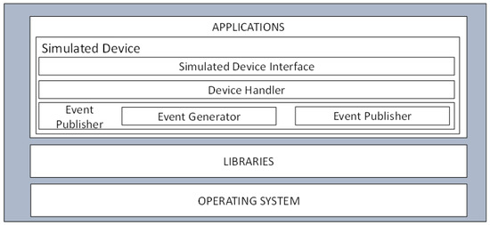 To provide sensing data to the intelligent edge computing platform, the simulated IoT device is designed in raspberry pi 3 model B. The designed model is launched on the ubuntu operating system and libraries as an application. The model composes an event generator, event publisher, device handler, and simulated device interfaces. The simulated device interface receives requests from the device service of the intelligent edge computing platform, then invokes proper functions of the device handler to generate an event and finally publishes the event with the event publisher. Detailed Information is depicted in Figure 5.