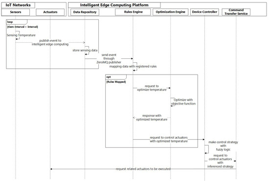 The sequence diagram of the proposed intelligent edge computing platform for controlling the smart home environment is depicted in Figure 6. The sensors in the IoT networks detect temperature information of a smart home. Then, previously transfer data to the data repository by REST APIs are exposed by the data repository. When the data repository receives the data sent from sensors of IoT networks, it will issue the data with an event and store them. The rules engine is listening to the event with the ZeroMQ subscriber. When the data repository issues an event through the ZeroMQ publisher it will deliver to receivers of this event. If data match any rules that are registered in the rule engine, they will invoke a related function to execute further processing. In our scenario, when the received event brings the current temperature of the smart home, the rules engine will invoke an optimization engine to obtain the optimized temperature that is a trade-off responds energy consumption and the desired environment setting of residents in a smart home. When an optimization engine response with an optimized temperature, the rules engine invokes the device controller to properly control the smart home. Finally, the device controller calls the command transfer service to send the commands to actuators of IoT networks to maintain the status of the smart home.