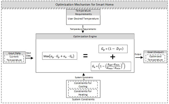 We illustrate the block diagram of the proposed objective function model of the optimization mechanism in Figure 7. The proposed model is comprised of input data, output, system constraints, temperature requirements, and an optimization engine. The input data inject the current temperature into the optimization engine; with the system constraints and temperature requirements of users, the optimization engine generates optimized temperature.