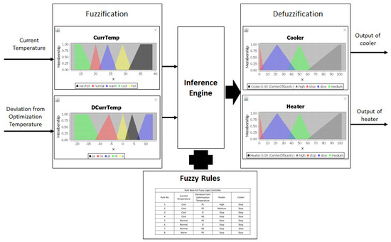 | Input: current temperature, and optimized temperature. Output: level of cooler, and heater. Initialize double to store deviation from the optimization temperature.Initialize double to store the level of the heater. Initialize double to store the level of the cooler. Initialize class to store the level the of cooler and heater. Initialize fuzzy logic inference engine as to generate the level of the cooler and heater. optimized temperature – current temperature; set the variable current temperature with the current temperature; set the variable store deviation from the optimization temperature with dot; evaluate to generate the level of the cooler and heater; obtain the variable of the heater; obtain the variable of the cooler; set the heater with ; set the cooler with ; return ; | |