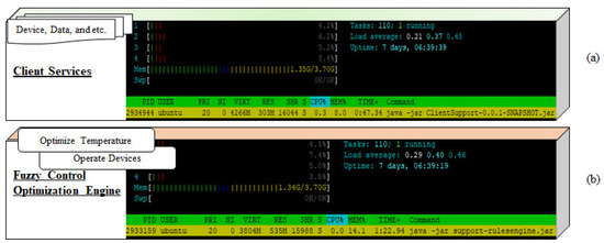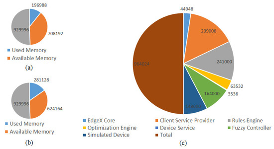 Figure 17, illustrates the memory usage of the proposed microservices of the system on the Raspberry Pi 3. We use two Raspberry Pi 3 pieces of hardware, as shown in Figure 17a,b, to execute the system. The total memory of each device is 929,996 kb, in which the running process takes 196,988 kb, and 281,128 kb, the total available memory is 1,332,356 kb. According to Figure 17c, the total memory of the microservices is 964,024 kb, and hence we have enough memory to run the microservices. The rules engine, client service provider, fuzzy controller, and simulated device microservices take most memory usage. All the services are developed with a java-based spring boot framework that supports REST APIs for other services and clients. The optimal engine takes 63,532 kb to provide optimization capability to the intelligent edge computing framework and developed with the ASP.net Core framework which is based on the C# language. The EdgeX core services, such as core data, core command, and core metadata running on the Docker container are implemented with Go to provide basic services for the intelligent edge computing framework through consuming 44,948 kb of memory. The device service is also implemented with Go to provide services that take 3536 kb of memory. According to the statistics, it is evident that Go-based services consume less memory compared to C#- and Java-based services.
