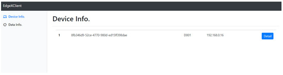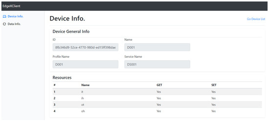 Figure 13, shows an implementation result of device management for presenting device detail information to the user using a user interface of the web client service. The user interface displays the device detail page that includes device detail including the device’s ID, name, profile name, service name, and resource list. The information is retrieved by the selected device ID from the Device List Page. The information is delivered as a JSON format data provided from Metadata of EdgeX framework. The detailed information of a device includes properties of the device and a list of resources. Each resource in the list has two types of method used for accessing the resource to obtain the sensing data and control actuator.