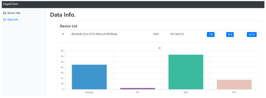 Figure 15, represents the implementation result for presenting statistical data of a device that is selected from the device list. For each resource of the selected device, the history data are requested and calculated to be statistical data. Once a device is selected for presenting the statistical data, the Web Client requests the EdgeX framework to obtain the history data and results from the statistical data for each resource. The first statistic bar presents an average of the retrieved data, the second is a standard deviation, the third is the maximum, and the fourth one is the minimum.