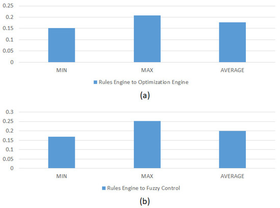 Figure 18a presents the execution time of the optimization engine that is requested by the rules engine. The optimization engine is implemented with the C# language to provide optimization capability to the intelligent edge computing framework. According to the statistics, we can understand that the minimum time is 0.152 s, averaging at 0.177 s, and the maximum time is 0.207 s.