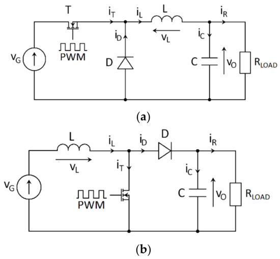 An MPPT system can be basically built with any type of DC/DC converter, but the most common are buck (Figure 2a) and BOOST (Figure 2b) converters operating in continuous conduction mode (CCM) [1,12,16,17]. Those two types of converters are popular mostly because of their simplicity and high efficiency (above 90%) [17,18].