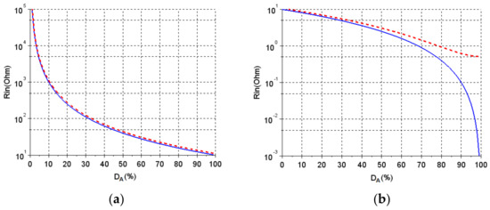 where Rin-i is the theoretical value of the input resistance calculated with Equations (1) or (3) and where Rin-ni is the theoretical value of the input resistance calculated with Equations (2) or (4).