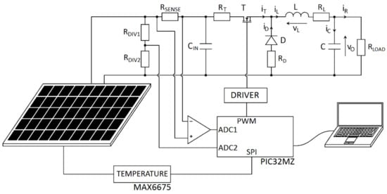 To evaluate the influence of the parasitic resistances on the input resistance of a buck converter, a dedicated measurement system was designed and built. The system consisted of a PIC32MZ microcontroller (Microchip Technology Inc., Chandler, AZ, USA) that generated a PWM signal, measuring the voltage, current, and temperature of a PV panel and sending the acquired data to a computer via a USB port (Figure 5).