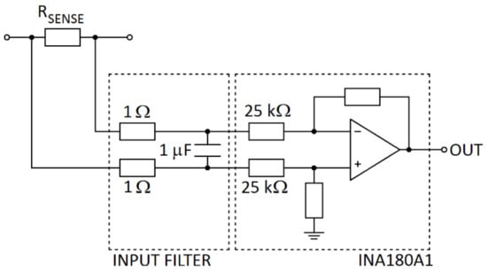 The current was measured with a 0.1 Ω sense resistor and a differential amplifier (INA180A1). Additionally, the differential amplifier featured a low-pass input filter (Figure 6) to suppress any high-frequency noise from the converter (i.e., the chopped input current). The cut-off frequency of the filter was set to 79.5 kHz. The gain error of the differential amplifier, caused by the 1 Ω resistors of the input filter, was less than 0.1%, which was a satisfactory value. The system enabled measurement of a maximum of 1.5 A and 25 V with a theoretical accuracy of 0.4 mA and 6.2 mV, respectively.