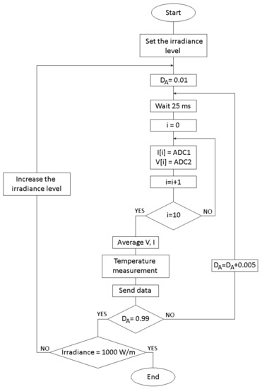 The panel temperature was measured using a thermocouple and a MAX6675 IC (Maxim Integrated, San Jose, CA), which featured a resolution of 0.25 °C. The simplified algorithm of the measurement is shown in Figure 7. The panel was illuminated for a short period of time (5 s) using halogen lamps. The short exposure time was required to maintain the temperature of the panel at a constant level of 25 °C. A longer exposure time could lead to additional errors due to the influence of the temperature on the panel characteristics. The heating curve of the PV panel illuminated with the halogen lamps is depicted in Figure A4.