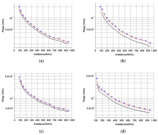 Input resistance of a buck converter at the maximum power point for different irradiance levels: (a) PV 10 W, RLOAD = 10 Ω; (b) PV 10 W, RLOAD = 5 Ω; (c) PV 5 W, RLOAD = 10 Ω; and (d) PV 5 W, RLOAD = 5 Ω. The solid line is the ideal model, the dashed lines are the model with parasitic resistances, and the dots represent the experimental data (measurements).