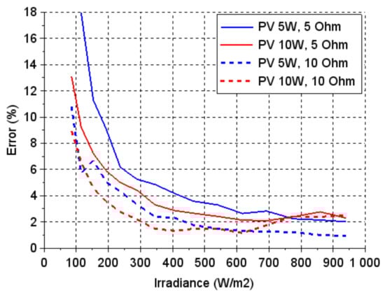 Notably, for lower values of irradiance, even the model of a non-ideal converter, including the parasitic resistances, showed less consistency in comparison with the measurements. The differences started to accumulate slowly. For higher irradiance levels, the accuracy varied from 1% to 2% in comparison with the measured value (Figure 9), whereas for the lowest irradiance, the discrepancies reached up to 18% (the difference between the measurement and non-ideal model for the 5 W panel and 5 Ω resistance).