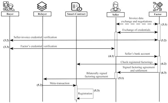 There are also trust issues related to factoring. The factor has to trust the buyer to have paid the amount of invoice by the due deadline, and the buyer has to comply with the factoring contract between the seller and the factor. Moreover, a malicious seller may try to cash an invoice at multiple factors to fraudulently double the amount of received money. This issue is known as double factoring, and it is a main problem that a factoring system needs to prevent. In more detail, double factoring is possible because there are no insights between factors, whether an invoice has already been financed or not []. In general, the implication of the buyer is necessary to provide awareness between factors in whether an invoice has already been financed.
