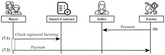 In the third and last phase, the factor pays the seller after checking the information registered by the smart contract. Later, the buyer will pay the complete invoice amount to the factor also, after checking the information registered by the smart contract. The steps followed in this phase are described next (see Figure 5):