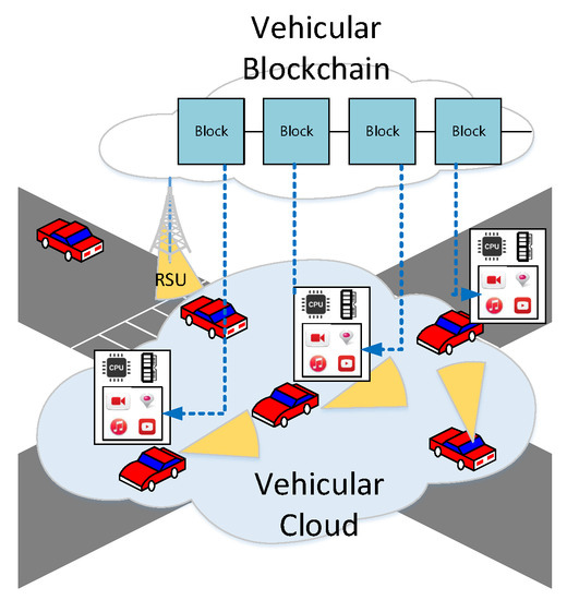 Recently, several studies about the vehicular blockchain have been introduced in which the blockchain for the security and privacy protection of safety and traffic data, crowd-sourcing for the error correction of sensor data, or deep learning have been used. Initially, Sharma et al. [4] proposed a vehicular network architecture based on the blockchain system for the intelligent transport systems of a smart city. Using the consensus algorithms of the blockchain, Yang et al. [5] introduced a trust management system for traffic safety and efficiency, and Su et al. [6] proposed a credit-based algorithm for rescue collaboration in disaster regions. Zhang et al. [7] provided a mechanism for a decentralized, secure and reliable database using the vehicular blockchain, and Kang et al. [8] exploited mobile edge computing (MEC) for the same purpose. Furthermore, Li and Feng et al. [9,10] tried to solve a privacy preserving problem for vehicular networking. Regarding crowd-sourcing, Li et al. [11] adopted the vehicular blockchain in order to correct GPS error. Fu and Dai et al. [12,13] introduced a permissioned blockchain architecture for deep reinforcement learning in vehicular edge computing. Most of the aforementioned works focused on the security and privacy protection of vehicular data in the vehicular blockchain.