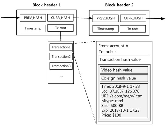 For data integrity, a hash value of video data, , using the public key of a publisher, , can be used. Figure 2 shows an example block that includes meta-data of the video and its hash value to check data integrity in a blockchain. A consumer requests the video data from the publisher using the video URI. Checking that the video is uploaded by the publisher is performed by comparing the recreated hash value and that available from the block.