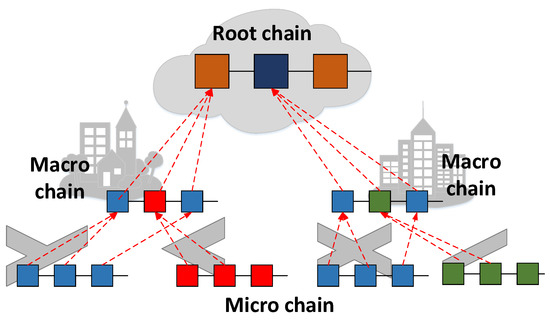 Example of a hierarchical autoCoin blockchain that consists of multi-layers such as root, macro and micro blockchains. The macro chain covers a city area and the micro-chain deals with small districts or several roads.