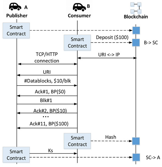 For the first two challenges of trading concurrency, the data should be encrypted so that it cannot be used at the consumer side before payment. The payment should be processed simultaneously with the receipt of a decryption key; however, this concurrency cannot be achieved directly by two peers. Instead, we propose a smart contract to solve this problem, which plays the role of a third party broker between the two peers.