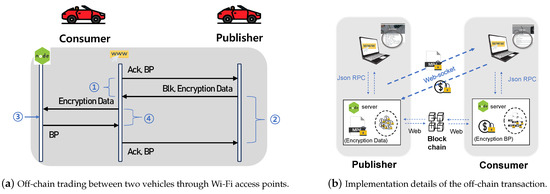 Listing A1 shows the smart contract codes written in the Solidity language [62] for content information and a channel structure for the off-chain transaction. The meta-data include some parameters to describe content, as we discuss in Section 3.1, and a hash value for data integrity. Furthermore, witness information can be added as digital signatures of witness addresses. The channel structure maintains information between two vehicles, such as the two vehicles’ account addresses, the deposit amount, duration (i.e., grace period), content serials, balance proof and encryption keys for the off-chain trading. The channel has three states—initial, suspended and complete—and either a publisher and consumer can suspend and resume the off-chain transaction within the grace period.