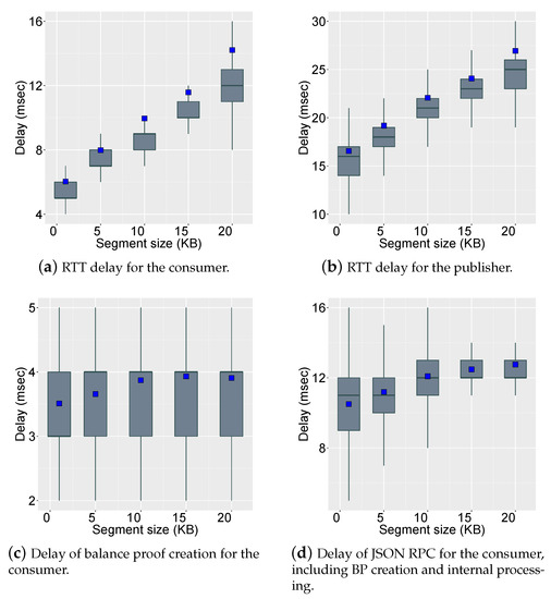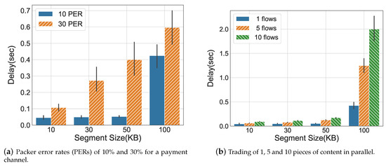 The consumers can consume multiple contents at the same time, which causes concurrent payment and content delivery. Figure 11a shows the payment delay results for different numbers of trades, with 1, 5 and 10 data flows with 10% PER. The average payment delay increased in proportion to the number of multi-hop payments, but was comparable until 50 KB segment. For the 100 KB segment, the delay increased exponentially as packet loss occurred severely according to Figure 11b. The latency difference was distinguishable for the cases of flow numbers; the average delay for a segment was 2 s for 10 content flows, while it was around 0.4 s for 1 content flow. Increasing the data flow induces congestion in the payment processing of the PSPs and content forwarding in the underlying network.