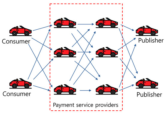 The next experiment involved indirect trading using multi-hop payment though intermediate vehicles, as described in Figure 6. For the test-bed shown in Figure 10. we created 10 vehicle instances in the cloud, including two publishers and consumers, respectively, and eight PSP vehicles, similar to vehicles B and C in Figure 6. We assumed that there were different contents available for the two publishers’ and the two consumers’ queries and requested the contents independently. However, other configurations for this experiment were the same as before. The path for the multi-hop payment could be different for each transaction; solid arrows indicate the possible payment direction for each vehicle and each vehicle decides their next hop based on the balance of the next-hop vehicles.