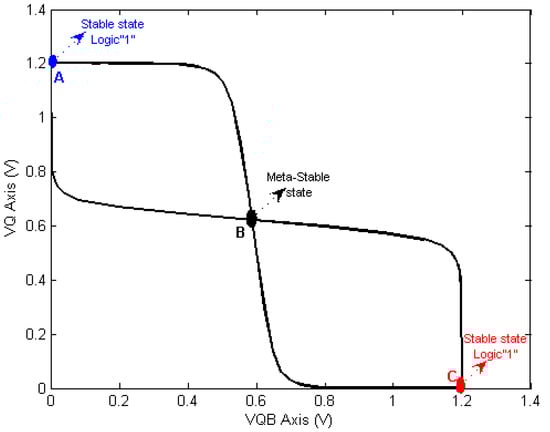 Butterfly plot of the SRAM cell. A and B are stable states, and C is metastable.