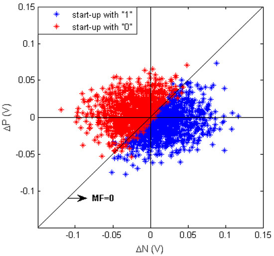 where WF is obtained by transient Monte Carlo simulations and applying an optimization process to adjust the MF parameter to the simulated SUV. A fitting process to optimize the number of cells whose SUV is equal to the sign of MF is performed, and after that, WF value of 0.765 is obtained. Figure 3 shows and values obtained with Monte Carlo simulations of an SRAM cells using a 65 nm commercial technology. Cells with SUV Q = ‘0’ are red colored, while cells with SUV Q = ‘1’ are blue. In addition, a line representing the MF = ‘0’ values are also plotted and splits the figure into two zones. Figure 3 represents the MF values accounting for the WF optimization; in addition, the SUV values are represented by each dot color. Most cells located above the MF = ‘0’ line (MF positive) start at ‘0’ value, while most cells located below the MF = ‘0’ line (MF negative) start at ‘1’ value. Furthermore, there are a few cells that show an unpredicted behavior when MF is near 0 (close to the MF = ‘0’ line). Despite this, all cells with high enough MF absolute values show an SUV that can be predicted by the MF parameter.
