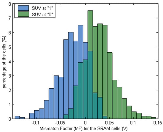 Mismatch factor histograms depicting the SUV in different colors. The unpredictable memory cells obtained with 65 nm CMOS 6T-SRAM can be observed by the overlap of histograms, which are all close to MF = ‘0’.
