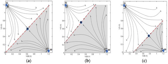 Therefore, if the cell is started up from any initial condition positioned on the separatrix line, the state trajectory will travel to the meta-stable state, as shown in Figure 5a. The influence of process variation and mismatch, on the other hand, will drive the state trajectory of a non-ideal memory cell towards one of the stable states.