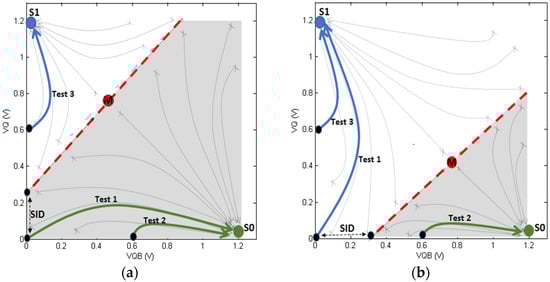 The suggested tests and SID metric are provided in the phase space of memory cell evolution: (a) for an asymmetrical cell with a propensity towards logic ‘0’, and (b) for an asymmetrical cell with a tendency toward logic ‘1’.