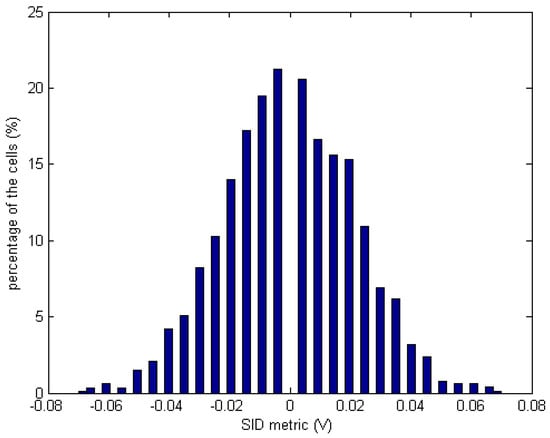 Positive SID values are assigned to the cells that have a tendency to logic state ‘0’ (these are the cells that have intersection with the Q-axis, as shown in Figure 6a), while the sign is negative for the cells with a tendency to logic state ‘1’ (intersection with the QB axis, Figure 6a). The histogram of the SID values obtained for each cell is shown in Figure 7. The most reliable cells are located at the extremes of the histogram, since they have the largest SID values, and therefore their separatrix are shown far from the ideal position and thus have a larger area of attraction towards one of the stable states of the cell.