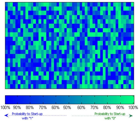 When noise was present, some cells switched SUVs every time they started up, whilst others have a more consistent SUV. The SRAM cells were successively powered up 200 times using Monte Carlo simulations to observe the repeatability of SUVs. Prior to power-up of the memory cells, it is necessary to ensure that both Q and QB cell nodes are completely discharged. Each memory cell’s statistical SUV behavior is calculated and expressed as the probability of starting up in one of two states: logic ‘0’ or logic ‘1’. Figure 10 shows a graphic representation of the chance of SUVs as a result of using this technique, where the color variations denote the preferred SUV probability.